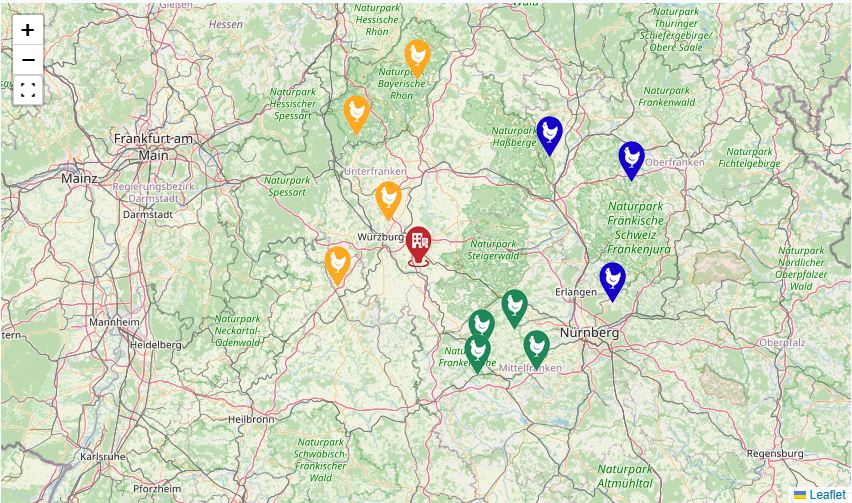 Verschaffe Dir einen schnellen Überblick über unseren Verein: Auf der interaktiven Karte findest Du den Standort unseres Verwaltungsbüros sowie die Mitgliedsbetriebe der GEG in den drei fränkischen Regierungsbezirken. So wird sichtbar, wie breit wir regional aufgestellt sind – von kleinen Familienbetrieben bis zu größeren Erzeugergemeinschaften, ökologisch wie konventionell.